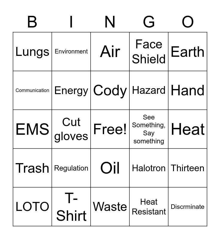 This bingo card has a free space and 75 words: 1886, Accident, Air, Barcode, Blood, Blue Zone, Box, Calvin, Cardboard, Chemicals, Chris, Clearwater Act, Cody, Communication, Contaminants, Cut gloves, Cut Sweater, Discrminate, Drug Tests, Earth, Emergency, EMS, Energy, Environment, Face Shield, Fire, Five, Flamaility, Float Glass, Forklift, Glass, Global Harmonized System(GHS), Halo Zone, Halotron, Hand, Hazard, Health, Heartattack, Heat, Heat Resistant, Heat Stroke, HMIS Labels, Human Race, Jim, Knife, Liability, LOTO, Lungs, Management, Moraine, Ohio, Oil, Oxygen, Pictograms, Plan Do Check Act, Policy, Pollution, Rack, Raw, Recyling/Recycle, Regulation, Report, Rive, Safety Data Sheet(SDS), Safety Glass, See Something, Say something, Smoking, Standardization, Termination, Thirteen, Trash, T-Shirt, Violation, Waste and Water.