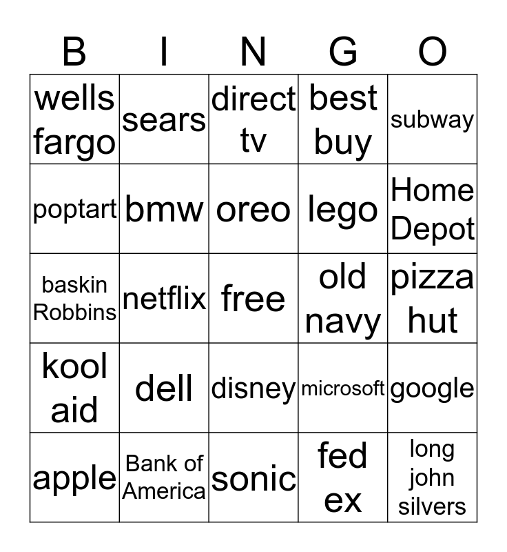This bingo card has a free space and 24 words: dell, Bank of America, oreo, apple, subway, wells fargo, poptart, sears, old navy, disney, lego, baskin Robbins, microsoft, google, bmw, fed ex, pizza hut, direct tv, Home Depot, netflix, long john silvers, kool aid, best buy and sonic.
