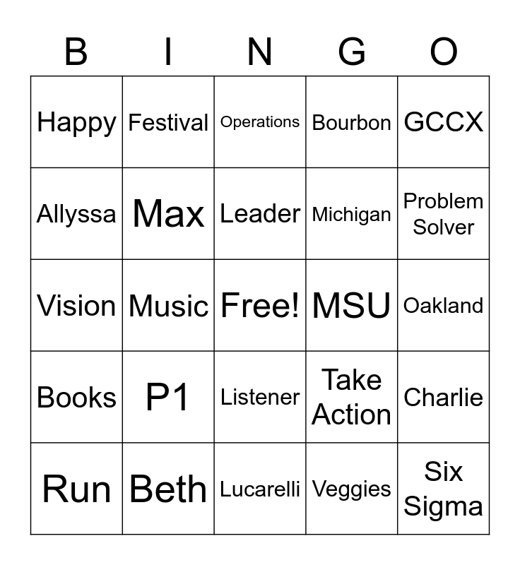 This bingo card has a free space and 24 words: P1, Beth, Leader, Run, GCCX, Happy, Allyssa, Festival, MSU, Listener, Michigan, Vision, Take Action, Charlie, Max, Veggies, Oakland, Operations, Problem Solver, Music, Six Sigma, Books, Bourbon and Lucarelli.