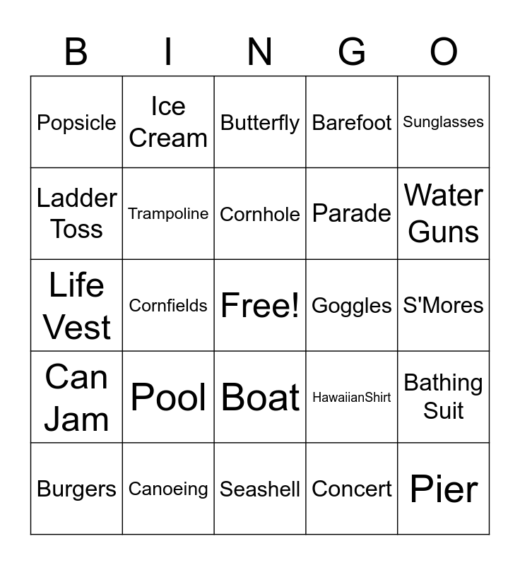 This bingo card has a free space and 120 words: 4th of July, A/C, Anchor, August, Backyard, BBQ, Barefoot, Baseball, Bathing Suit, Beach, Beach Chair, Beach Ball, Bees, Bikini, Blistering, Boardwalk, Boat, Bonfire, Breeze, Bright, Burgers, Butterfly, Bicycle, Camp Fire, Camping, Can Jam, Canoeing, Chlorine, Coconut, Coleslaw, Concert, Cornfields, Cornhole, Cruise, Dandelion, Disney, Fairs, Fesivtal, Fireflies, Fireworks, Fishing, Flip Flops, Float, Flowers, Frisbee, Garden Hose, Gardening, Goggles, Golf, Grass, Green, Hammock, HawaiianShirt, Hiking, Hop Scotch, Hotdogs, Humid, Hurricane, Jet Skit, Ice Cream, Jump Rope, June, Kayak, Kite, Kool-Aid, Ladder Toss, Lady Bug, Lake, Lawn Mower, Lemonade, Life Vest, Lifegaurd, Lobster Roll, Mosquitos, Motorcycle, Paddle Board, Parade, Picnic, Pier, Pool, Popsicle, Road Trip, Sailboat, Sand, Sandcastle, Seaglass, Seashell, Shade, Shorts, Shovel, Slip'n'SLide, S'Mores, Snorkel, Softserve, Sprinkler, Starfish, Sunburn, Sunglasses, Sunny, Surfboard, Sweet Tea, Swimming, Tennis, Time Off, Towel, Trampoline, Trunks, Umbrella, Underwater, Vacation, Wisor, Volleyball, Wakeboarding, Wasps, Water Guns, Watermelon, Waterpark, Waves, Wildfire and Yard Sales.
