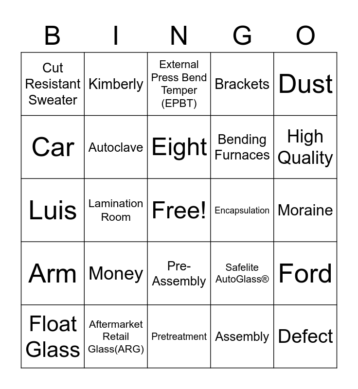 This bingo card has a free space and 59 words: Accident, Aftermarket Retail Glass(ARG), Antenna, Arm, Assembly, Auto Glass, Autoclave, Bend, Bending Furnaces, BMW, Brackets, Broom, Car, Competitors, Customer, Cut Resistant Sweater, Defect, Dust, Earbuds, Eight, Encapsulation, External Press Bend Temper (EPBT), Float Glass, Ford, Forklift, Furnace, Happy, Hearing Protection, High Quality, Hospital, Hot, Ice, Inspector, Jim, Kimberly, Lace, Laminated Glass, Lamination Room, Life, Luis, Mold, Money, Moraine, Neck, Original Equipment Manufacturer(OEM), OSHA, Pattern, PPE, Pre-Assembly, Pretreatment, Products, PVB, Quality, Raw Glass, Red Tag, Safelite AutoGlass®, Safety Glass, Work in Progress (WIP) and World.