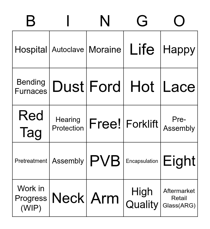 This bingo card has a free space and 52 words: Accident, Aftermarket Retail Glass(ARG), Antenna, Arm, Assembly, Auto Glass, Autoclave, Bend, Bending Furnaces, Defect, Dust, Earbuds, Eight, Encapsulation, External Press Bend Temper (EPBT), Float Glass, Ford, Forklift, Furnace, Happy, Hearing Protection, High Quality, Hospital, Hot, Ice, Inspector, Jim, Kimberly, Lace, Laminated Glass, Lamination Room, Life, Luis, Mold, Money, Moraine, Neck, Original Equipment Manufacturer(OEM), OSHA, Pattern, PPE, Pre-Assembly, Pretreatment, Products, PVB, Quality, Raw Glass, Red Tag, Safelite AutoGlass®, Safety Glass, Work in Progress (WIP) and World.