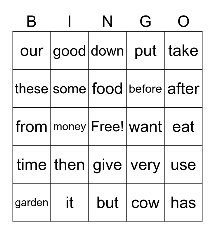 This bingo card has a free space and 24 words: then, it, food, garden, take, our, these, good, want, give, before, from, very, use, some, cow, eat, down, after, money, has, time, put and but.