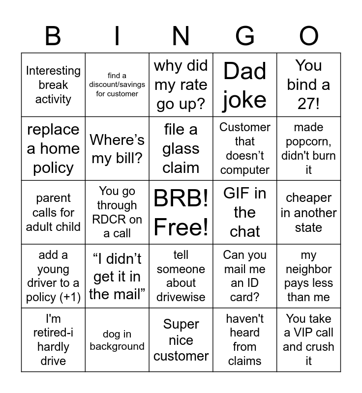 This bingo card has a free space and 55 words: Constant complainer, I'm retired-i hardly drive, Mike used to take care of it, Interesting break activity, Super nice customer, I should pay this-not that, Where’s my bill?, Good movie/tv recommendation, Customer that doesn’t computer, We ask about life insurance, Dad joke, Fun eagent note, Email address that makes you giggle, Over-sharer, Meemo? Momo? Nemoo?, Salad and Go, You bind a 27!, You go through RDCR on a call, Is Martina there?, You take a VIP call and crush it, GIF in the chat, “I’m old-school”, Can you mail me an ID card?, why did my rate go up?, Existing customer signs up for ezp, file a glass claim, haven't heard from claims, makes coffee, cheaper in another state, my neighbor pays less than me, my headphones, bind new to us home, bind new to us auto, bind new to us condo, replace a home policy, parent calls for adult child, roadside, add a young driver to a policy (+1), run customer service defense, tell me about milewise, find a discount/savings for customer, GRUMPSTER, I want to talk to Misty, AP is being a jerk, “I didn’t get it in the mail”, dog in background, child in background, mystery person on camera, call to reinstate or suspend auto, made popcorn, didn't burn it, take out the recycling, quote a bundle, send POI to 3rd party, tell someone about drivewise and offer a pup quote to a current customer.