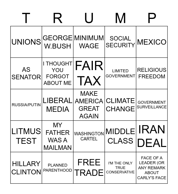 This bingo card has a free space and 24 words: MY FATHER WAS A MAILMAN, PLANNED PARENTHOOD, FAIR TAX, HILLARY CLINTON, MEXICO, UNIONS, AS SENATOR, GEORGE W.BUSH, CLIMATE CHANGE, WASHINGTON CARTEL, LIMITED GOVERNMENT, RUSSIA/PUTIN, MIDDLE CLASS, IRAN DEAL, I THOUGHT YOU FORGOT ABOUT ME, I'M THE ONLY TRUE CONSERVATIVE, GOVERNMENT SURVEILLANCE, MINIMUM WAGE, RELIGIOUS FREEDOM, LIBERAL MEDIA, FACE OF A LEADER (OR ANY REMARK ABOUT CARLY'S FACE, LITMUS TEST, SOCIAL SECURITY and FREE TRADE.