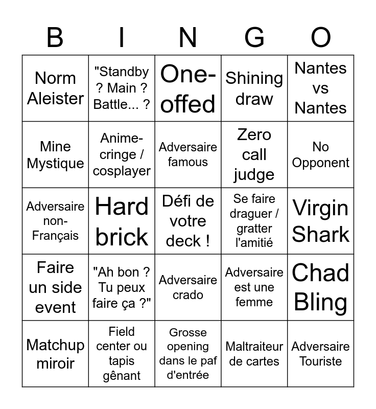 This bingo card has a free space and 24 words: "Ah bon ? Tu peux faire ça ?", Field center ou tapis gênant, Adversaire famous, Matchup miroir, Nantes vs Nantes, Norm Aleister, Mine Mystique, "Standby ? Main ? Battle... ?, Se faire draguer / gratter l'amitié, Adversaire crado, Zero call judge, Adversaire non-Français, Adversaire est une femme, Chad Bling, Anime-cringe / cosplayer, Maltraiteur de cartes, Virgin Shark, One-offed, No Opponent, Hard brick, Adversaire Touriste, Faire un side event, Shining draw and Grosse opening dans le paf d'entrée.