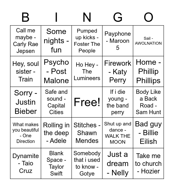 This bingo card has a free space and 25 words: Rolling in the deep - Adele, Somebody that i used to know - Gotye, Ho Hey - The Lumineers, Dynamite - Taio Cruz, Sail - AWOLNATION, Call me maybe - Carly Rae Jepsen, Hey, soul sister - Train, Some nights - fun, If i die young - the band perry, Stitches - Shawn Mendes, Firework - Katy Perry, Sorry - Justin Bieber, Shut up and dance - WALK THE MOON, Bad guy - Billie Eilish, Psycho - Post Malone, Say you won’t let go - James Arthur, Body Like a Back Road - Sam Hunt, Pumped up kicks - Foster The People, Home - Phillip Phillips, Safe and sound - Capital Cities, Take me to church - Hozier, Blank Space - Taylor Swift, What makes you beautiful - One Direction, Payphone - Maroon 5 and Just a dream - Nelly.