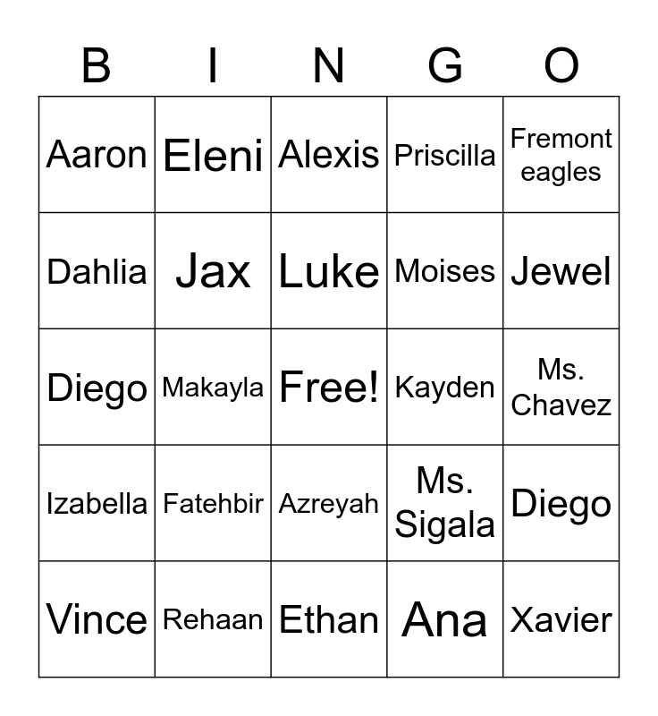 This bingo card has a free space and 28 words: Diego, Carly, Moises, Ana, Dahlia, Alexis, Eleni, Izabella, Kayden, Vince, Diego, Priscilla, Rehaan, Ethan, Jewel, Reid, Fatehbir, Jax, Luke, Azreyah, Aaron, Bella, Xavier, Makayla, Ms. Chavez, Ms. Sigala, Fremont eagles and Fourth Grade.