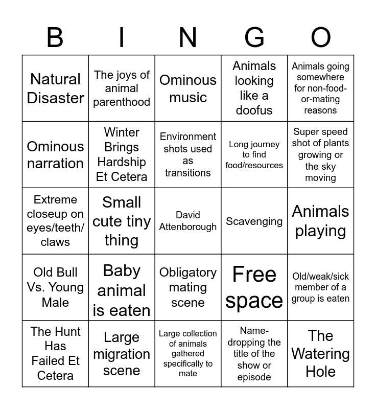 This bingo card has 25 words: Baby animal is eaten, Large collection of animals gathered specifically to mate, Environment shots used as transitions, The Hunt Has Failed Et Cetera, Animals going somewhere for non-food-or-mating reasons, Natural Disaster, Ominous narration, The joys of animal parenthood, Scavenging, Obligatory mating scene, Long journey to find food/resources, Extreme closeup on eyes/teeth/ claws, Free space, Old/weak/sick member of a group is eaten, Winter Brings Hardship Et Cetera, The Watering Hole, Animals playing, Ominous music, Super speed shot of plants growing or the sky moving, Small cute tiny thing, David Attenborough, Large migration scene, Old Bull Vs. Young Male, Animals looking like a doofus and Name-dropping the title of the show or episode.