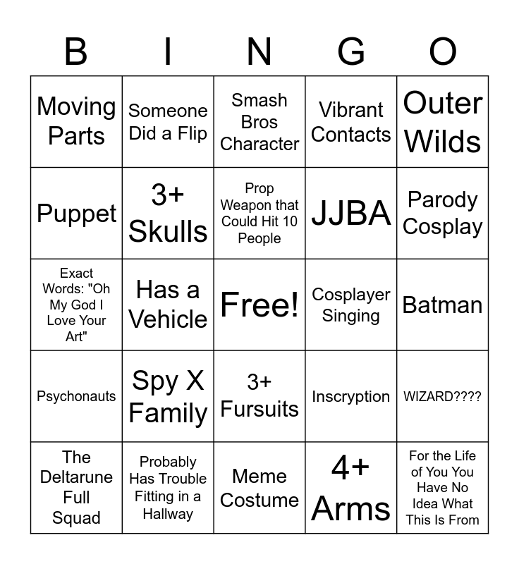 This bingo card has a free space and 24 words: Spy X Family, Probably Has Trouble Fitting in a Hallway, Prop Weapon that Could Hit 10 People, The Deltarune Full Squad, Outer Wilds, Moving Parts, Puppet, Someone Did a Flip, Cosplayer Singing, 3+ Fursuits, JJBA, Exact Words: "Oh My God I Love Your Art", Inscryption, WIZARD????, 3+ Skulls, 4+ Arms, Batman, Smash Bros Character, Parody Cosplay, Has a Vehicle, For the Life of You You Have No Idea What This Is From, Psychonauts, Vibrant Contacts and Meme Costume.