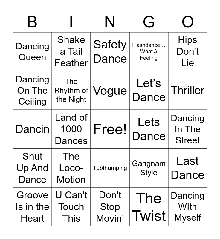 This bingo card has a free space and 73 words: Pump Up The Jam, Gonna Make You Sweat ( EveryBody Dance Now), Dancing Queen, Single Ladies ( Put a Ring on It), Walk Like an Egyptian, I Wanna Dance With Somebody ( Who Loves Me ), Shut Up And Dance, Jump Around, Gangnam Style, Disco Inferno, Tiny Dancer, Dance The Night Away, The Rhythm of the Night, Dancing In The Street, Dance To The Music, Shake a Tail Feather, Don't Stop Movin’, Dancing On The Ceiling, Footloose, Lets Dance, Vogue, Flashdance… What A Feeling, Hips Don't Lie, YMCA, Groove Is in the Heart, I Like To Move It, Dancing In The Dark, Party All The Time, This Is How We Do It, Apache, U Can't Touch This, Cotton Eye Joe, Gettin’ Jiggy Wit It, Macarena, Land of 1000 Dances, Electric Boogie, Into The Groove, Bust A Move, Dancing WIth Myself, Don't Stop ‘Til You Get Enough, The Twist, The Loco-Motion, It Takes Two, Levitating, Blood on The Dance Floor, Let’s Dance, Safety Dance, Just Dance, Dance Tonight, Dancin, Evacuate The Dancefloor, Rhythm Nation, Some Days You Gotta Dance, Dancin’ the Night Away, The Git Up, I Don't Feel Like Dancin’, Freeze - Frame, Tubthumping, Conga, Shake Your Groove Thing, Jump in The Line, One, Two Step, It’s Not Unusual, Thriller, The Hustle, Boot Scootin’ Boogie, Dance With Me, Born To Hand Jive, Last Dance, Mary Jane’s Last Dance, Save The Last Dance For Me, Dance Apocalyptic and Why Don't We Just Dance.