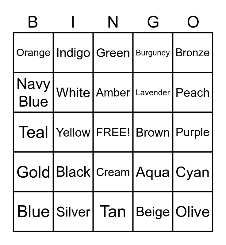 This bingo card has a free space and 29 words: Blue, Red, Yellow, Violet, Orange, Green, White, Black, Brown, Silver, Purple, Olive, Tan, Beige, Peach, Magenta, Cream, Gold, Bronze, Teal, Aqua, Coral, Lavender, Navy Blue, Burgundy, Indigo, Cyan, Amber and Turquoise.