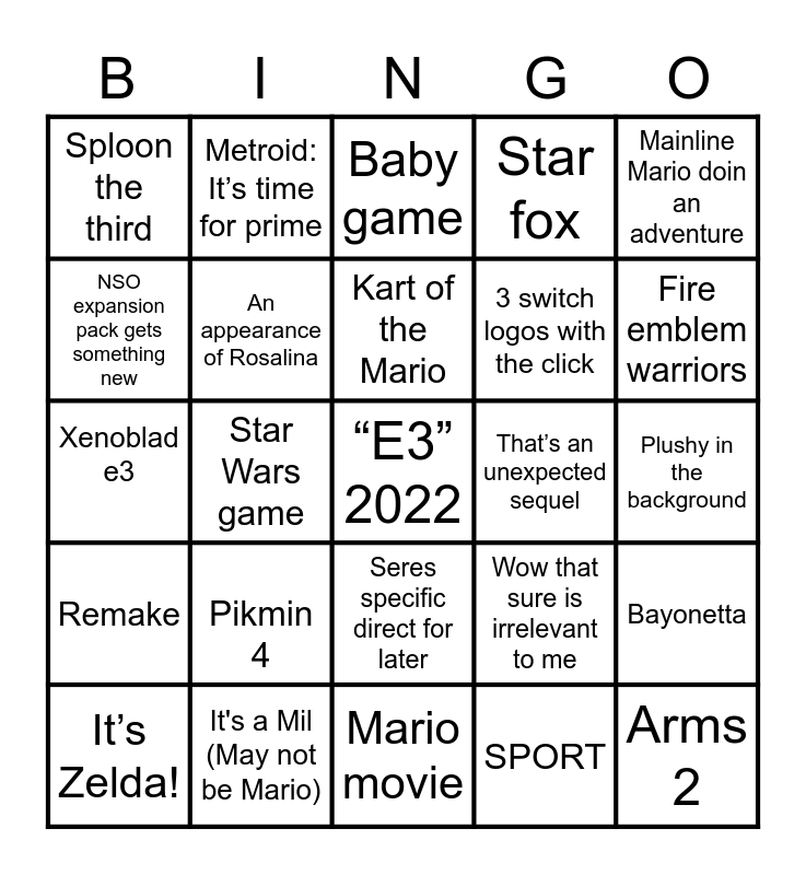 This bingo card has a free space and 24 words: Pikmin 4, It's a Mil (May not be Mario), Kart of the Mario, It’s Zelda!, Mainline Mario doin an adventure, Sploon the third, NSO expansion pack gets something new, Metroid: It’s time for prime, That’s an unexpected sequel, Seres specific direct for later, 3 switch logos with the click, Xenoblad e3, Wow that sure is irrelevant to me, Bayonetta, An appearance of Rosalina, SPORT, Plushy in the background, Baby game, Fire emblem warriors, Star Wars game, Arms 2, Remake, Star fox and Mario movie.