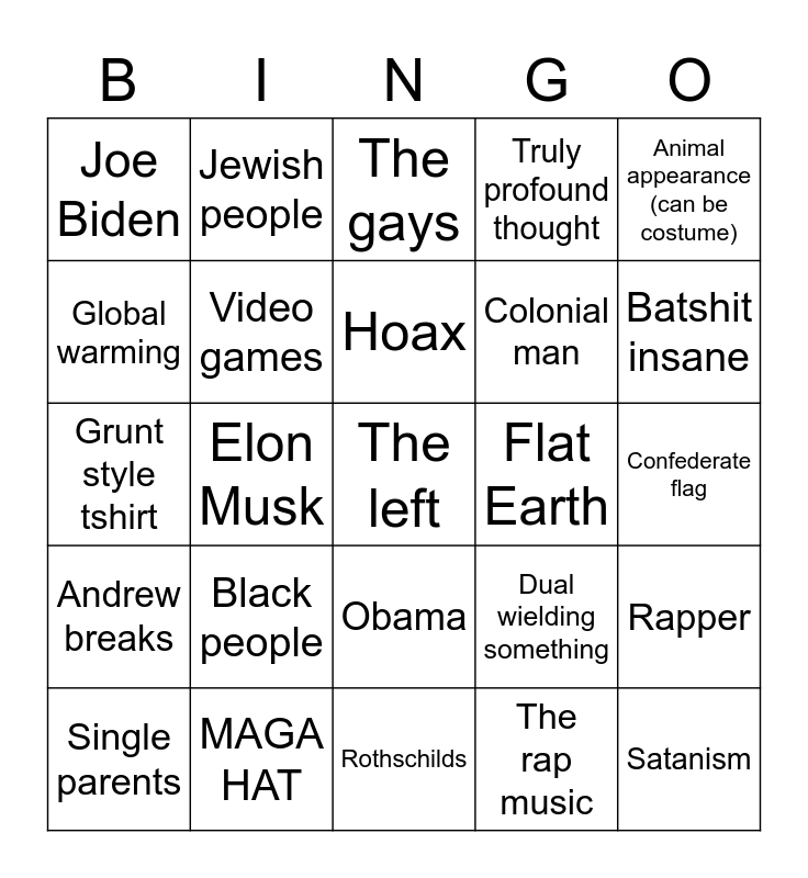 This bingo card has a free space and 24 words: Black people, MAGA HAT, Hoax, Single parents, Animal appearance (can be costume), Joe Biden, Global warming, Jewish people, Flat Earth, Obama, Colonial man, Grunt style tshirt, Dual wielding something, Rapper, Video games, The rap music, Confederate flag, The gays, Batshit insane, Elon Musk, Satanism, Andrew breaks, Truly profound thought and Rothschilds.