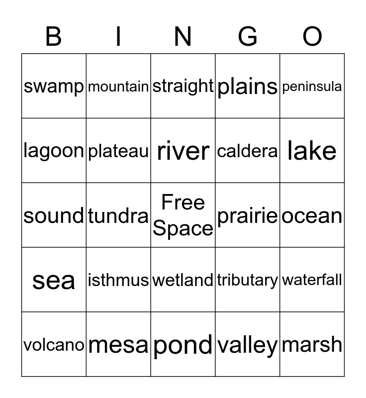 This bingo card has a free space and 24 words: isthmus, mesa, river, volcano, peninsula, swamp, lagoon, mountain, prairie, wetland, caldera, sound, tributary, waterfall, plateau, valley, ocean, straight, lake, tundra, marsh, sea, plains and pond.