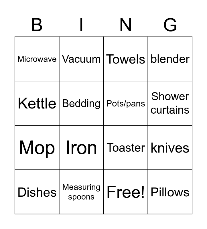This bingo card has 17 words: Free!, Dishes, Towels, Microwave, Iron, blender, knives, Pots/pans, Shower curtains, Bedding, Measuring spoons, Toaster, Kettle, Vacuum, Mop, Plunger and Pillows.