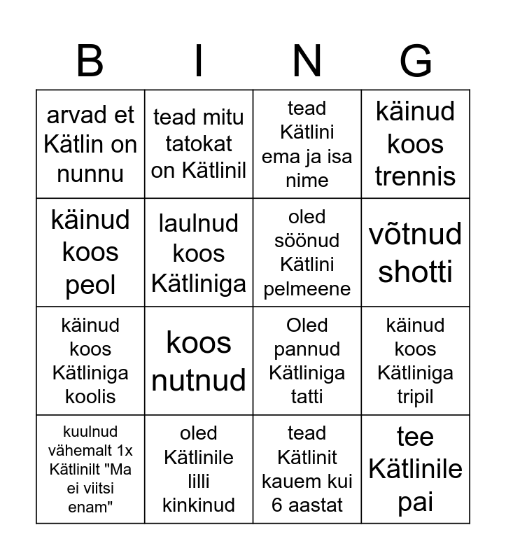 This bingo card has 16 words: oled Kätlinile lilli kinkinud, käinud koos Kätliniga tripil, tead Kätlini ema ja isa nime, arvad et Kätlin on nunnu, käinud koos Kätliniga koolis, tead mitu tatokat on Kätlinil, Oled pannud Kätliniga tatti, tead Kätlinit kauem kui 6 aastat, käinud koos peol, laulnud koos Kätliniga, kuulnud vähemalt 1x Kätlinilt "Ma ei viitsi enam", käinud koos trennis, koos nutnud, võtnud shotti, oled söönud Kätlini pelmeene and tee Kätlinile pai.