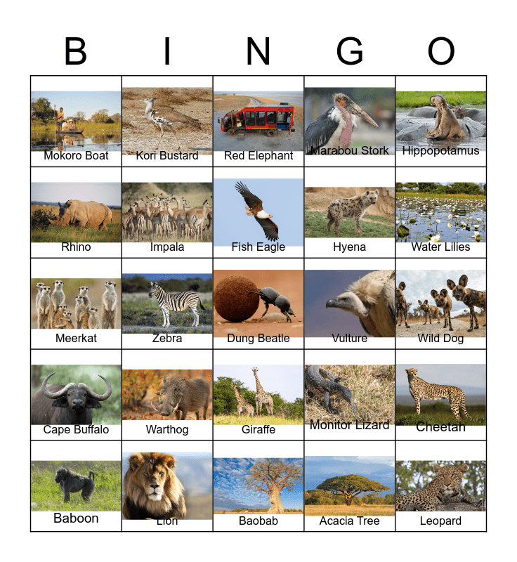 This bingo card has 30 images and 30 words: Lion, Elephant, Zebra, Ostrich, Mokoro Boat, Red Elephant, Impala, Giraffe, Vulture, Baobab, Wild Dog, Dung Beatle, Acacia Tree, Leopard, Water Lilies, Guinea Fowl, Monitor Lizard, Cape Buffalo, Warthog, Hippopotamus, Meerkat, Wildebeest, Kori Bustard, Hyena, Rhino, Marabou Stork, Cheetah, Baboon, Fish Eagle and Kudu.
