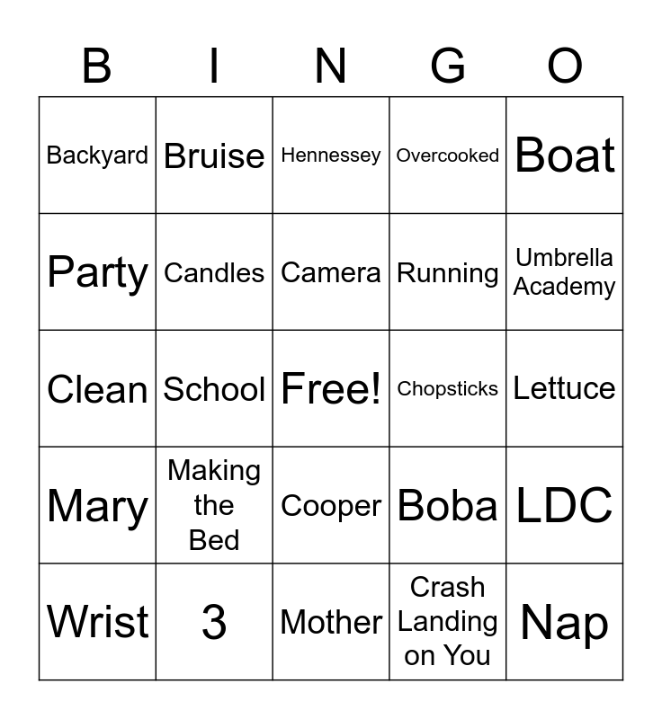 This bingo card has a free space and 51 words: MPV, Making the Bed, Hiking, Crash Landing on You, Umbrella Academy, Thumb, Bruise, LOL, Running, Nap, Clean, Candles, Boba, Lettuce, Shellfish, Soju, Hennessey, Chopsticks, Carolinas, Party, School, Lorde, Overcooked, Boat, Cars, Charcuterie, Camera, ABG, LDC, Backyard, Koi Fishes, Chickens, New York, Oregon, Peach, Green Apple, Bunny, Spiders, Toenail, 5, 3, Cooper, Flowers, Banana, Wrist, Feet, Mother, Navy, Charlie, Mary and Fried Chicken.