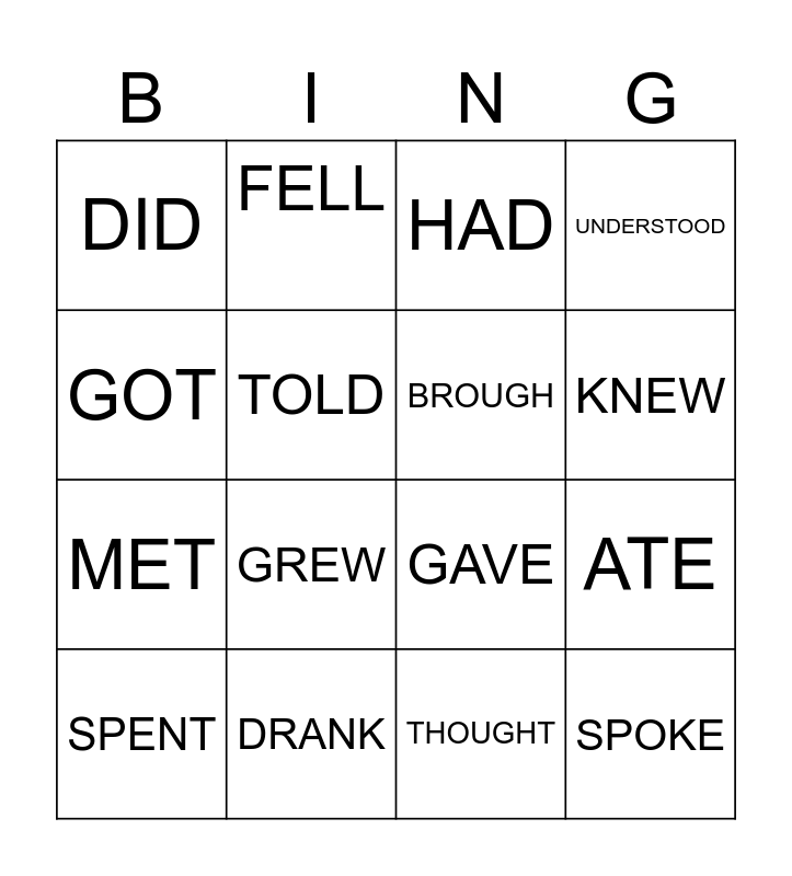 This bingo card has 32 words: FORGOT, FELT, ATE, CAME, SPOKE, BROUGH, GOT, TOOK, FELL, MADE, KNEW, HAD, BEGAN, WON, DRANK, WENT, BOUGHT, GAVE, HIT, WAS/WERE, FORGAVE, DREW, THOUGHT, WON, SPENT, UNDERSTOOD, MET, TOLD, DID, FROZE, ROSE and GREW.