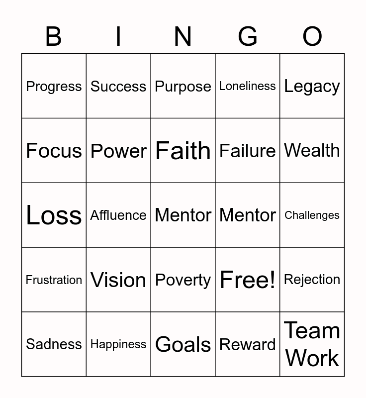 This bingo card has 25 words: Vision, Goals, Faith, Sadness, Legacy, Progress, Focus, Success, Mentor, Poverty, Failure, Loss, Free!, Rejection, Power, Team Work, Challenges, Purpose, Wealth, Affluence, Mentor, Happiness, Frustration, Loneliness and Reward.