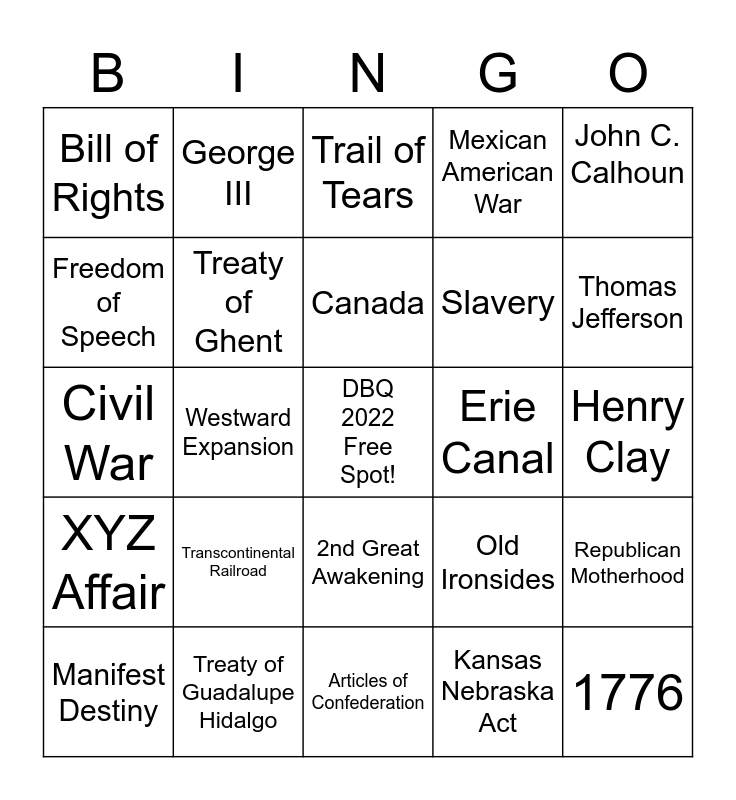This bingo card has a free space and 24 words: Manifest Destiny, Transcontinental Railroad, Canada, Kansas Nebraska Act, John C. Calhoun, Bill of Rights, George III, Trail of Tears, Erie Canal, Henry Clay, Civil War, Treaty of Ghent, Old Ironsides, Republican Motherhood, Freedom of Speech, Treaty of Guadalupe Hidalgo, Articles of Confederation, Mexican American War, Thomas Jefferson, XYZ Affair, Westward Expansion, 2nd Great Awakening, Slavery and 1776.