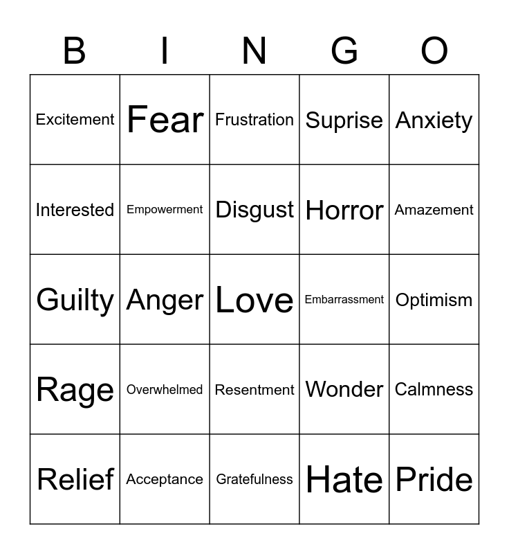 This bingo card has 30 words: Acceptance, Happiness, Anger, Sadness, Excitement, Frustration, Empowerment, Resentment, Embarrassment, Gratefulness, Optimism, Love, Hate, Pride, Amazement, Vengeful, Wonder, Rage, Overwhelmed, Anxiety, Guilty, Amusement, Fear, Horror, Interested, Suprise, Calmness, Relief, Disgust and Appreciation.