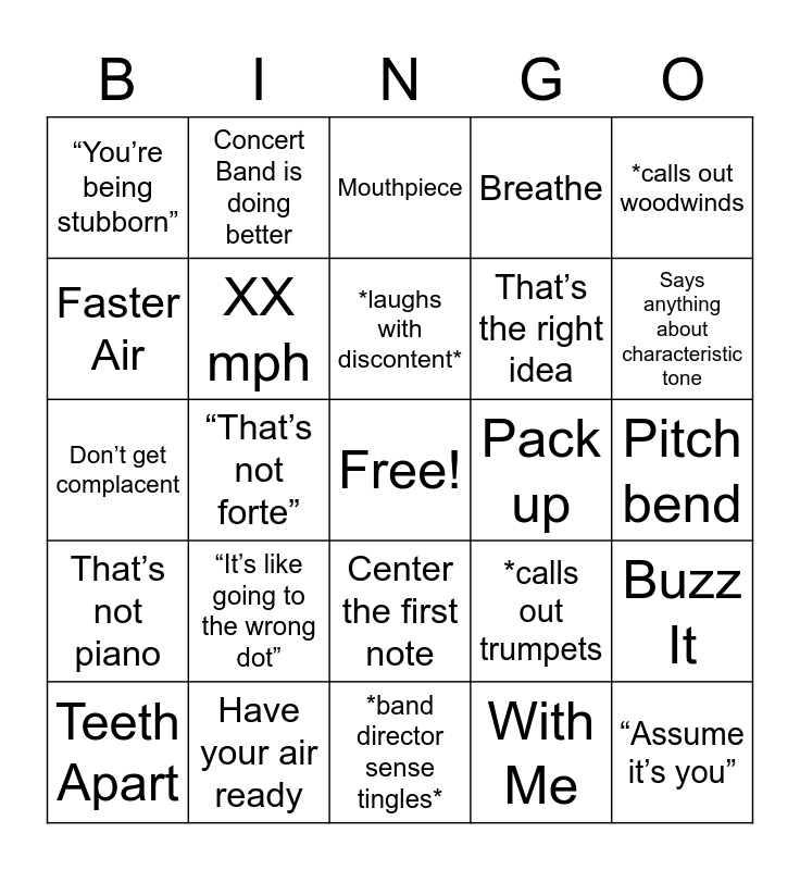 This bingo card has a free space and 28 words: Buzz It, One at a Time, That’s the right idea, With Me, Faster Air, Mouthpiece, Concert Band is doing better, That’s not piano, Pack up, Teeth Apart, Don’t get complacent, Breathe, Have your air ready, *band director sense tingles*, Says anything about characteristic tone, Bop it, “It’s like going to the wrong dot”, XX mph, *laughs with discontent*, Center the first note, “You’re being stubborn”, “It’s really rough guys”, “Assume it’s you”, “That’s not forte”, Pitch bend, *calls out trumpets, *calls out woodwinds and “More tuba”.