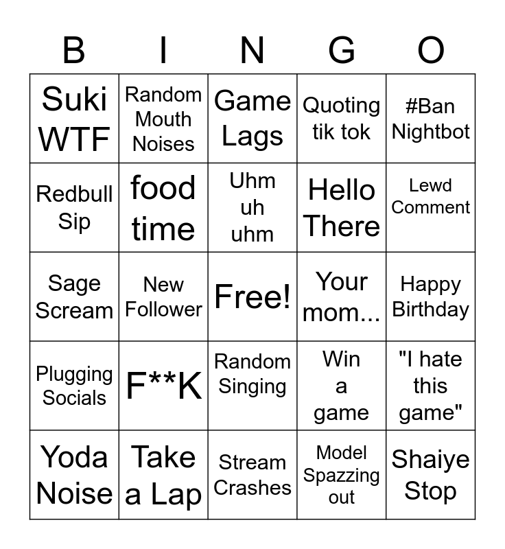 This bingo card has a free space and 24 words: F**K, Take a Lap, Uhm uh uhm, Yoda Noise, #Ban Nightbot, Suki WTF, Redbull Sip, Random Mouth Noises, Your mom..., Random Singing, Hello There, Sage Scream, Win a game, "I hate this game", food time, Model Spazzing out, Happy Birthday, Game Lags, Lewd Comment, New Follower, Shaiye Stop, Plugging Socials, Quoting tik tok and Stream Crashes.