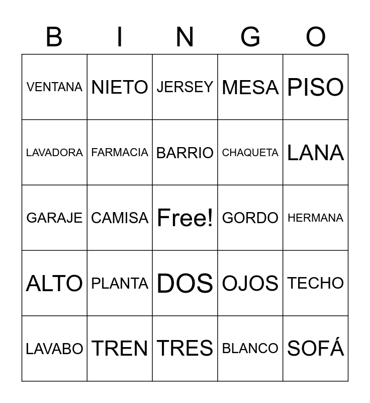 This bingo card has a free space and 69 words: VERDE, HERMANA, BICICLETA, BOSQUE, TREN, UNO, MESA, RELOJ, PISO, PLAZA, TECHO, ENTRADA, VENTANA, JERSEY, HIJO, CAMISA, DOS, CHAQUETA, ABRIGO, ALTO, GORDO, OJOS, LANA, ABUELA, AZUL, GRIS, ROJO, NEGRO, BLANCO, PERRO, NIETO, TÍO, PRIMA, NUEVA, PADRE, MADRE, COCHE, AVIÓN, LAVADORA, LÁMPARA, PLANTA, SOFÁ, CUADRO, SILLA, TELEVISIÓN, LAVABO, BAÑO, CASA, HOSPITAL, FARMACIA, BARRIO, COLEGIO, BIBLIOTECA, TRES, PIEL, SEDA, HABITACIÓN, SALÓN, COCINA, GARAJE, DORMITORIO, FAMILIA, ALEGRE, PANTALONES, FALDA, VESTIDO, CORTO, BIGOTE and BARBA.