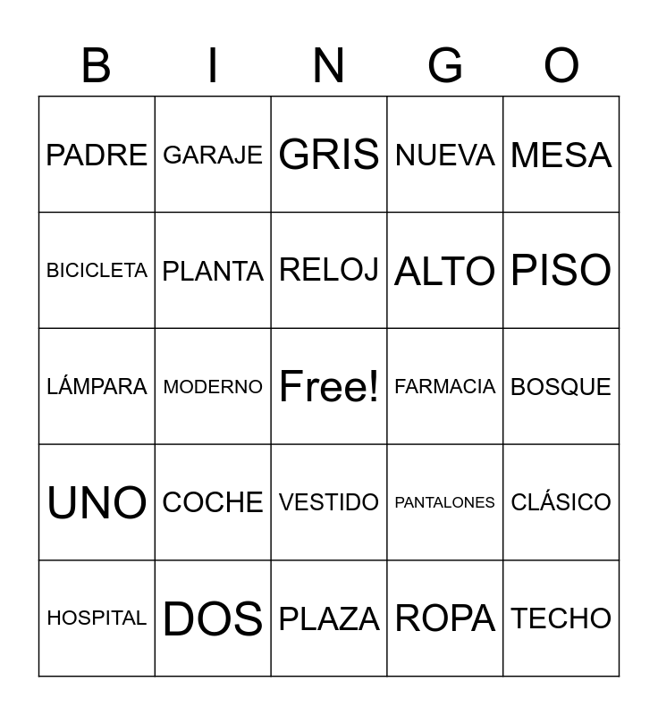 This bingo card has a free space and 80 words: VERDE, AZUL, GRIS, ROJO, NEGRO, BLANCO, HIJO, HERMANA, ABUELA, NIETO, TÍO, PRIMA, NUEVA, PADRE, MADRE, BICICLETA, TREN, COCHE, AVIÓN, BOSQUE, LAVADORA, MESA, LÁMPARA, RELOJ, PLANTA, SOFÁ, CUADRO, SILLA, TELEVISIÓN, LAVABO, PISO, CALLE, PLAZA, CASA, HOSPITAL, FARMACIA, BARRIO, COLEGIO, BIBLIOTECA, TECHO, ENTRADA, VENTANA, HABITACIÓN, SALÓN, COCINA, GARAJE, DORMITORIO, FAMILIA, ALEGRE, SERIO, CLÁSICO, MODERNO, PANTALONES, JERSEY, ABRIGO, CAMISA, CHAQUETA, PANTALONES, FALDA, VESTIDO, ALTO, GORDO, CORTO, BIGOTE, BARBA, OJOS, LANA, PIEL, SEDA, BAÑO, UNO, DOS, TRES, CUATRO, CINCO, TIENDA, ROPA, MUEBLES, PERRO and GATO.