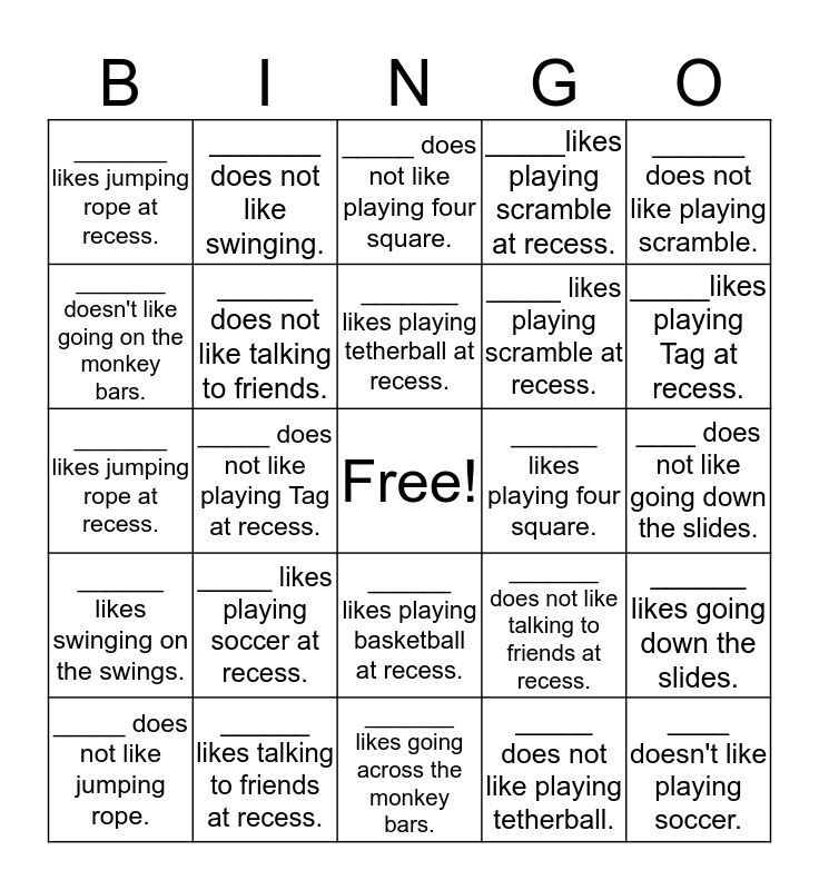 This bingo card has a free space and 24 words: _____ likes playing soccer at recess., ______ likes talking to friends at recess., _______ likes playing tetherball at recess., _____ does not like jumping rope., ______ does not like playing scramble., _______ likes jumping rope at recess., _______ doesn't like going on the monkey bars., _______ does not like swinging., ______ likes playing four square., ______ likes playing basketball at recess., _____ likes playing scramble at recess., _______ likes jumping rope at recess., _______ does not like talking to friends at recess., ______ likes going down the slides., ______ does not like talking to friends., _____ does not like playing tetherball., ____ does not like going down the slides., _____ does not like playing four square., _____likes playing Tag at recess., _____ does not like playing Tag at recess., ____ doesn't like playing soccer., ______ likes swinging on the swings., _____likes playing scramble at recess. and _______ likes going across the monkey bars..