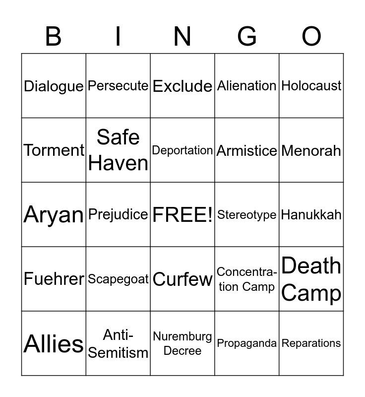 This bingo card has a free space and 24 words: Scapegoat, Anti- Semitism, Deportation, Allies, Holocaust, Dialogue, Torment, Persecute, Stereotype, Curfew, Armistice, Aryan, Concentra-tion Camp, Death Camp, Safe Haven, Propaganda, Hanukkah, Exclude, Menorah, Prejudice, Reparations, Fuehrer, Alienation and Nuremburg Decree.