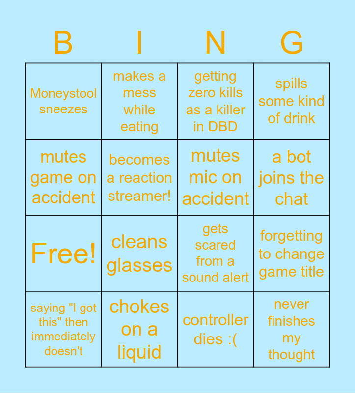 This bingo card has 20 words: saying "I got this" then immediately doesn't, saying im sorry two times in one sentence, getting zero kills as a killer in DBD, forgetting to change game title, doesn't escape as survivor, cleans glasses, controller dies :(, spills some kind of drink, Free!, makes a mess while eating, gets scared from a sound alert, a bot joins the chat, Moneystool sneezes, chokes on a liquid, mutes mic on accident, Moneystool sings along to a song, mutes game on accident, becomes a reaction streamer!, guess what i ate today and never finishes my thought.