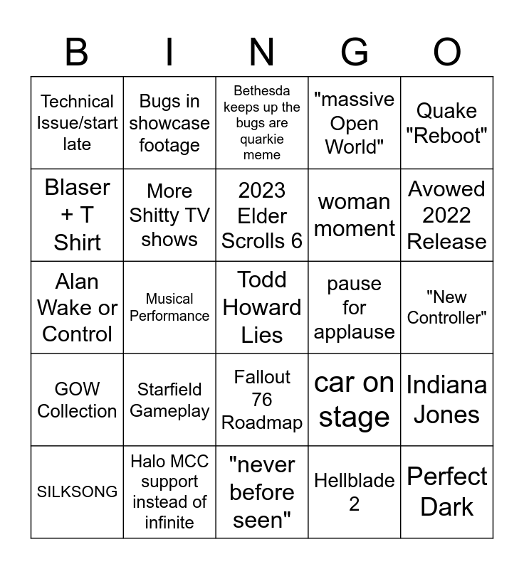 This bingo card has a free space and 24 words: Starfield Gameplay, Halo MCC support instead of infinite, 2023 Elder Scrolls 6, SILKSONG, Quake "Reboot", Technical Issue/start late, Blaser + T Shirt, Bugs in showcase footage, pause for applause, Fallout 76 Roadmap, woman moment, Alan Wake or Control, car on stage, Indiana Jones, More Shitty TV shows, Hellblade 2, "New Controller", Bethesda keeps up the bugs are quarkie meme, Avowed 2022 Release, Musical Performance, Perfect Dark, GOW Collection, "massive Open World" and "never before seen".
