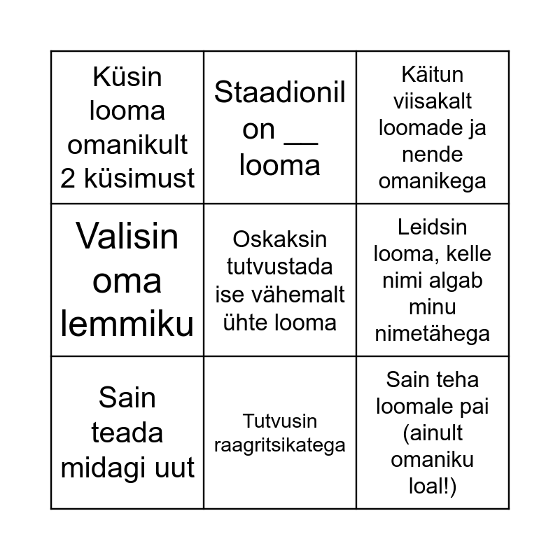 This bingo card has 9 words: Sain teada midagi uut, Käitun viisakalt loomade ja nende omanikega, Staadionil on __ looma, Valisin oma lemmiku, Küsin looma omanikult 2 küsimust, Leidsin looma, kelle nimi algab minu nimetähega, Oskaksin tutvustada ise vähemalt ühte looma, Sain teha loomale pai (ainult omaniku loal!) and Tutvusin raagritsikatega.