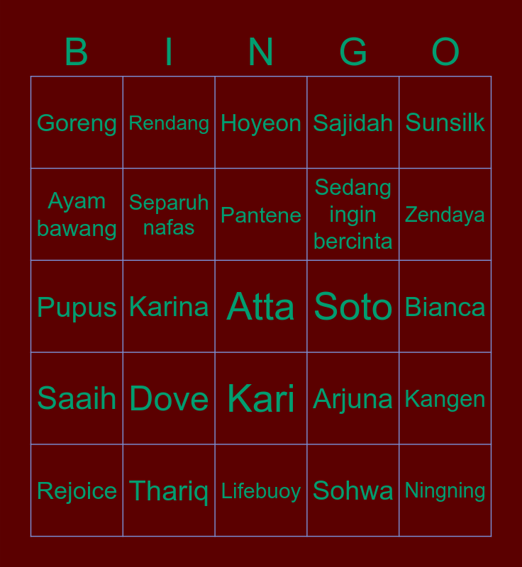 This bingo card has 25 words: Dove, Lifebuoy, Pantene, Rejoice, Sunsilk, Goreng, Ayam bawang, Rendang, Soto, Kari, Sedang ingin bercinta, Pupus, Arjuna, Kangen, Separuh nafas, Ningning, Bianca, Hoyeon, Zendaya, Karina, Atta, Thariq, Saaih, Sajidah and Sohwa.