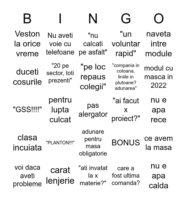 This bingo card has 25 words: "PLANTON!!!", "ati invatat la x materie?", "pe loc repaus colegii", voi daca aveti probleme, naveta intre module, Veston la orice vreme, duceti cosurile, Nu aveti voie cu telefoane, "ai facut x proiect?", adunare pentru masa obligatorie, "compania in coloana, liniile in plutoane? adunarea", "GSS!!!!", BONUS, ce avem la masa, "20 pe sector, toti prezenti", nu e apa calda, nu e apa rece, "nu calcati pe asfalt", modul cu masca in 2022, pentru lupta culcat, pas alergator, carat lenjerie, clasa incuiata, "un voluntar rapid" and care a fost ultima comanda?.