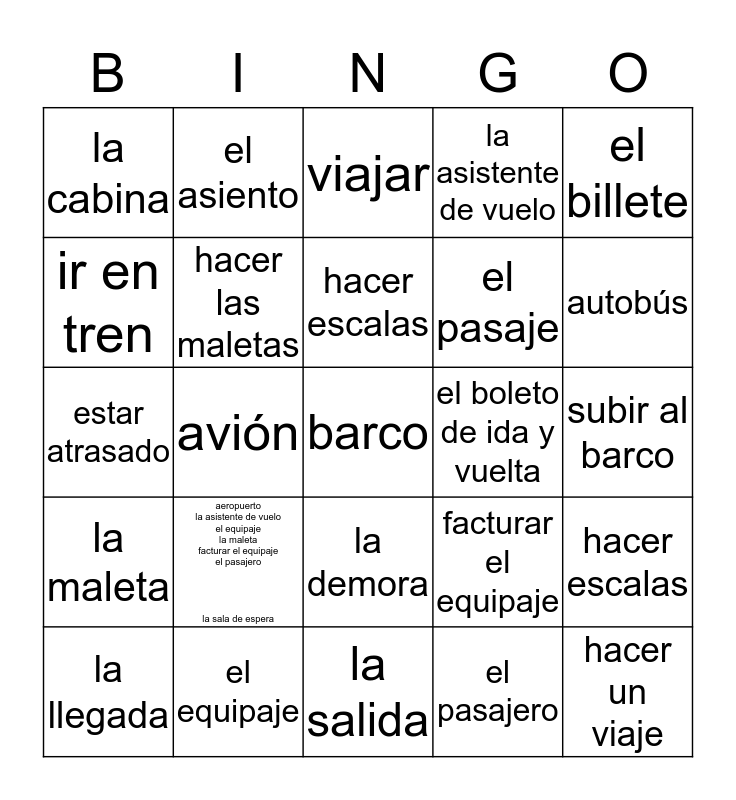 This bingo card has 25 words: aeropuerto la asistente de vuelo el equipaje la maleta facturar el equipaje el pasajero la sala de espera, la salida, hacer escalas, la llegada, el billete, la cabina, ir en tren, el asiento, el boleto de ida y vuelta, la demora, el pasaje, estar atrasado, facturar el equipaje, hacer escalas, hacer las maletas, hacer un viaje, subir al barco, viajar, autobús, avión, barco, el equipaje, la maleta, la asistente de vuelo and el pasajero.