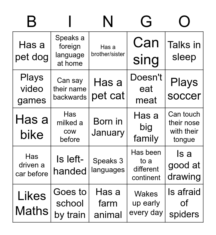 This bingo card has a free space and 24 words: Is left-handed, Goes to school by train, Has a pet cat, Likes Maths, Talks in sleep, Has a pet dog, Plays video games, Speaks a foreign language at home, Has a big family, Speaks 3 languages, Doesn't eat meat, Has a bike, Has been to a different continent, Is a good at drawing, Can say their name backwards, Wakes up early every day, Can touch their nose with their tongue, Has a brother/sister, Plays soccer, Has milked a cow before, Is afraid of spiders, Has driven a car before, Can sing and Has a farm animal.