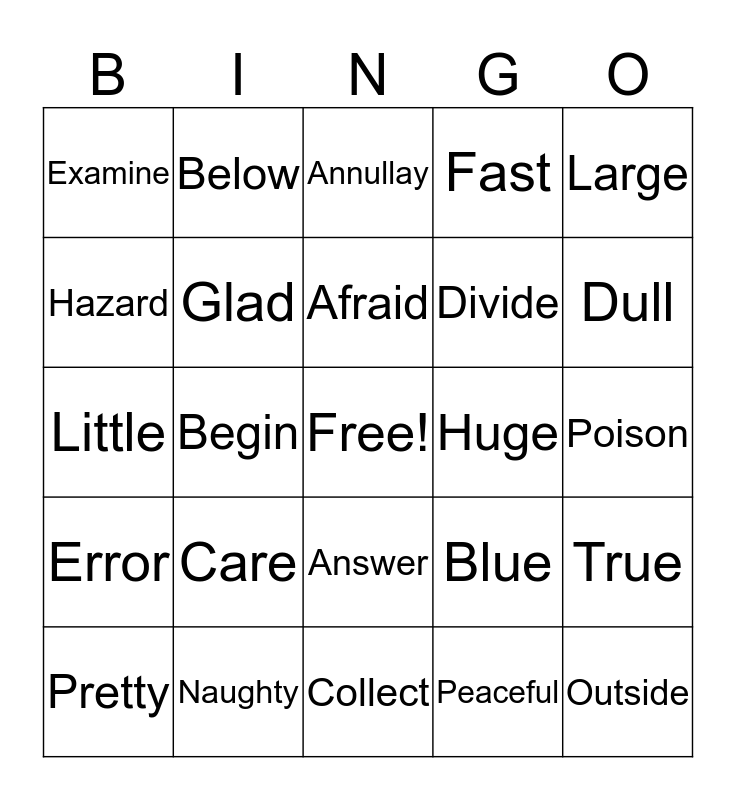 This bingo card has a free space and 24 words: Care, Naughty, Afraid, Pretty, Large, Examine, Hazard, Below, Huge, Answer, Divide, Little, Blue, True, Glad, Peaceful, Poison, Annullay, Dull, Begin, Outside, Error, Fast and Collect.
