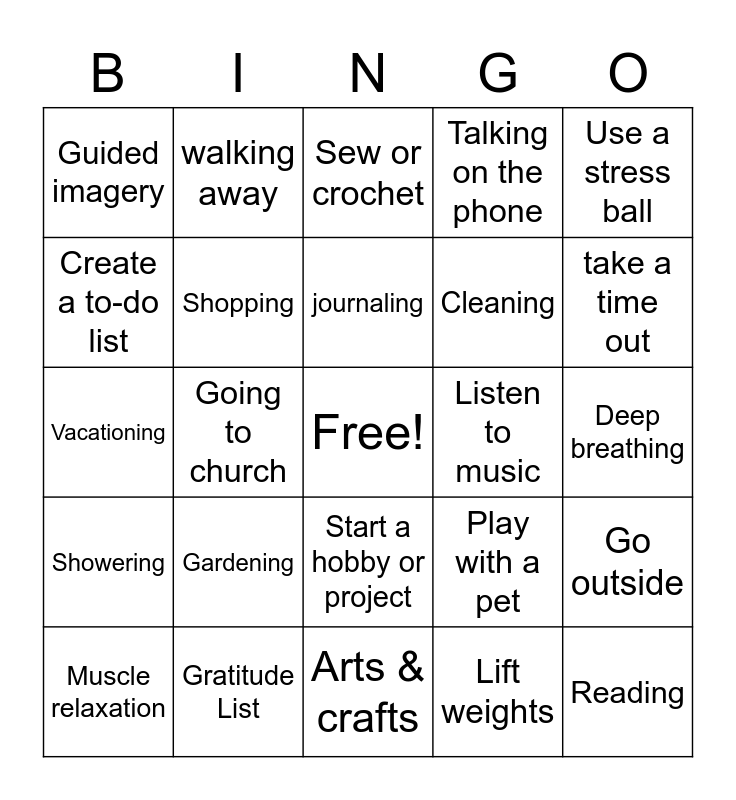 This bingo card has a free space and 24 words: Gardening, Gratitude List, journaling, Muscle relaxation, Use a stress ball, Guided imagery, Create a to-do list, walking away, Listen to music, Start a hobby or project, Cleaning, Vacationing, Play with a pet, Go outside, Shopping, Lift weights, Deep breathing, Sew or crochet, take a time out, Going to church, Reading, Showering, Talking on the phone and Arts & crafts.