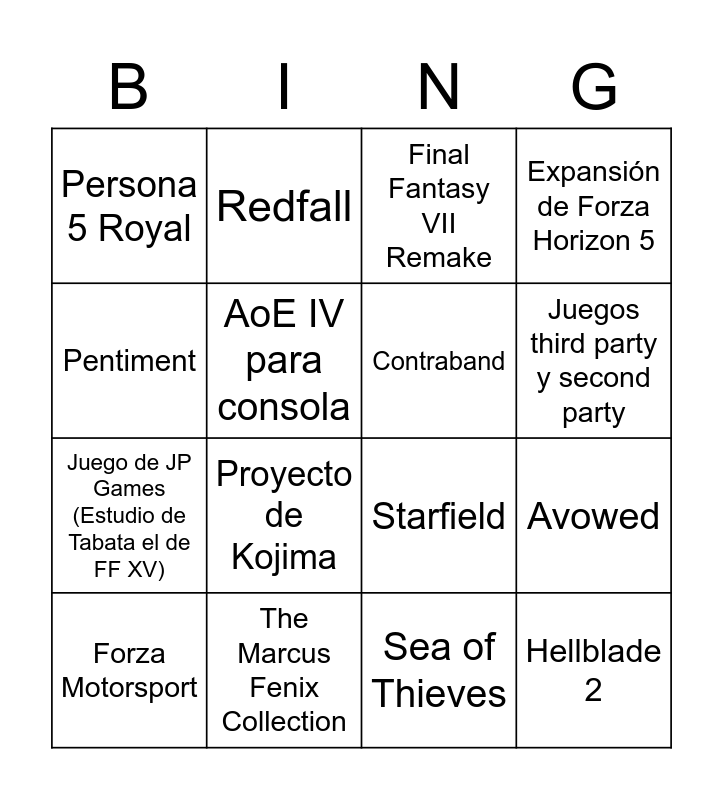 This bingo card has 16 words: The Marcus Fenix Collection, Avowed, Final Fantasy VII Remake, Persona 5 Royal, Juego de JP Games (Estudio de Tabata el de FF XV), Redfall, Starfield, Sea of Thieves, Pentiment, AoE IV para consola, Forza Motorsport, Expansión de Forza Horizon 5, Proyecto de Kojima, Juegos third party y second party, Contraband and Hellblade 2.