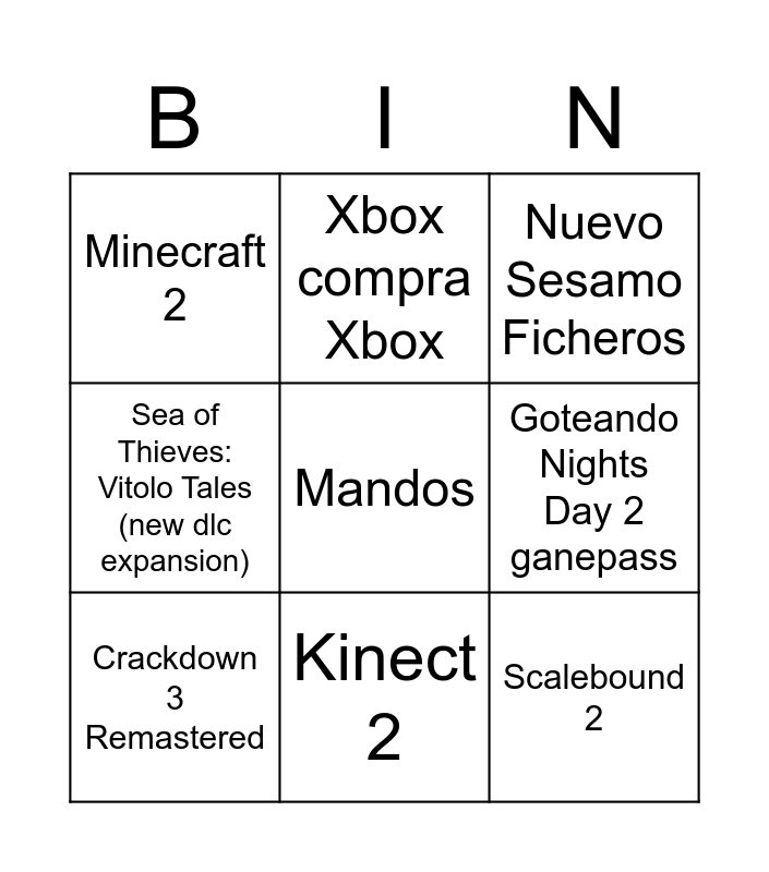 This bingo card has a free space and 8 words: Goteando Nights Day 2 ganepass, Nuevo Sesamo Ficheros, Xbox compra Xbox, Crackdown 3 Remastered, Minecraft 2, Scalebound 2, Sea of Thieves: Vitolo Tales (new dlc expansion) and Kinect 2.