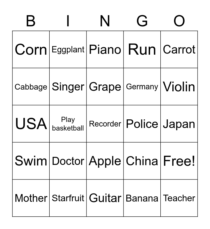 This bingo card has 26 words: Apple, Banana, Grape, Starfruit, Carrot, Corn, Cabbage, Eggplant, Japan, China, Germany, USA, Free!, Mother, Play basketball, Play badminton, Run, Swim, Piano, Recorder, Violin, Guitar, Police, Doctor, Singer and Teacher.