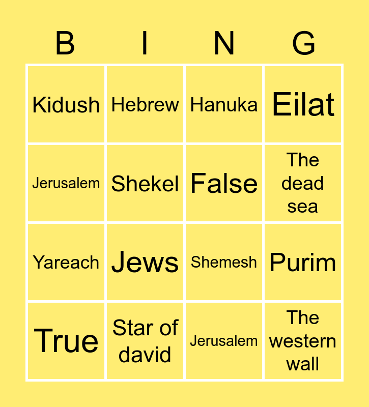 This bingo card has 16 words: Star of david, Purim, Hanuka, Kidush, Yareach, Hebrew, Shemesh, Jerusalem, Jerusalem, Shekel, True, Eilat, Jews, The dead sea, False and The western wall.