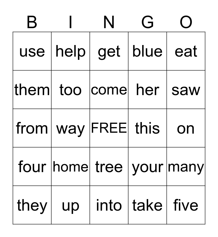 This bingo card has a free space and 24 words: home, up, come, they, eat, use, them, help, this, tree, her, from, your, many, too, take, on, get, saw, way, five, four, blue and into.