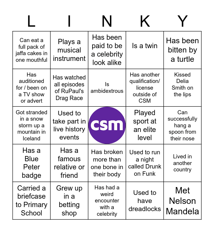 This bingo card has a free space and 28 words: Lived in another country, Speaks more than 1language, Has another qualification/ license outside of CSM, Used to have dreadlocks, Has auditioned for / been on a TV show or advert, Has been paid to be a celebrity look alike, Plays a musical instrument, Has a Blue Peter badge, Played sport at an elite level, Carried a briefcase to Primary School, Got stranded in a snow storm up a mountain in Iceland, Is a twin, Grew up in a betting shop, Has had a weird encounter with a celebrity, Kissed Delia Smith on the lips, Completed a marathon, Has a famous relative or friend, Has watched all episodes of RuPaul's Drag Race, Is ambidextrous, Has broken more than one bone in their body, Can eat a full pack of jaffa cakes in one mouthful, Played a sport in a famous stadium, Met Nelson Mandela, Used to take part in live history events, Can successfully hang a spoon from their nose, Used to run a night called Drunk on Funk, Has been bitten by a turtle and Travelled around Europe in a Fiat Ducato called Merry.