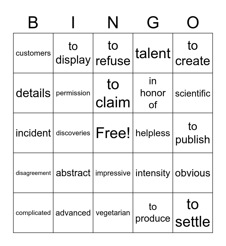 This bingo card has a free space and 24 words: abstract, advanced, to claim, complicated, to create, customers, details, to display, helpless, impressive, in honor of, incident, intensity, obvious, permission, to produce, to publish, to refuse, scientific, discoveries, to settle, disagreement, talent and vegetarian.