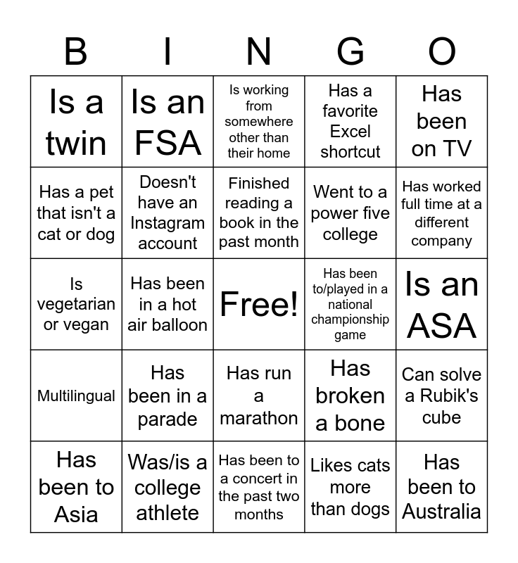 This bingo card has a free space and 30 words: Was/is a college athlete, Prefers working in offic, Has been in a hot air balloon, Knew what and Actuary was at age 10, Is a twin, Is working from somewhere other than their home, Doesn't have an Instagram account, Has run a marathon, Has been to/played in a national championship game, Has been to a concert in the past two months, Is an ASA, Has been to Australia, Likes cats more than dogs, Plays an instrumen t, Has worked full time at a different company, Started a COVID hobby, Has broken a bone, Multilingual, Has been in a parade, Has been on TV, Is vegetarian or vegan, Takes a backup calculator to their exams, Is an FSA, Went to a power five college, Has a pet that isn't a cat or dog, Has a favorite Excel shortcut, Can solve a Rubik's cube, Has been to Asia, Finished reading a book in the past month and Never seen an entire Star Wars film.